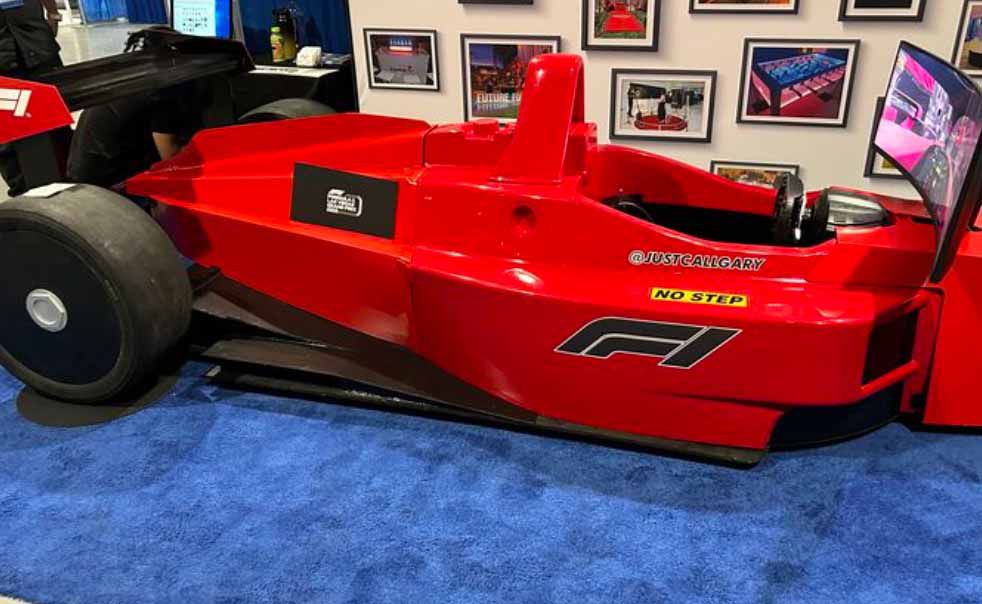 Simulateur de course statique avec une carrosserie finie en Rouge et une variété d'autocollants génériques pour lui donner l'apparence d'un vrai modèle.