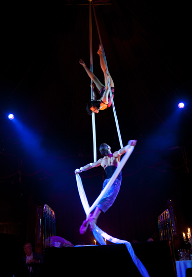 Artiste aérien primé et acrobates réalisant des spectacles uniques