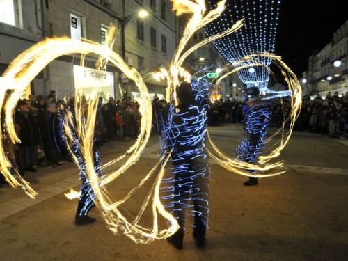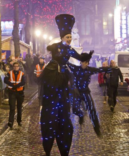 Comprend des personnages sur échasses, des jongleurs de feu, des feux d'artifice et des danseurs