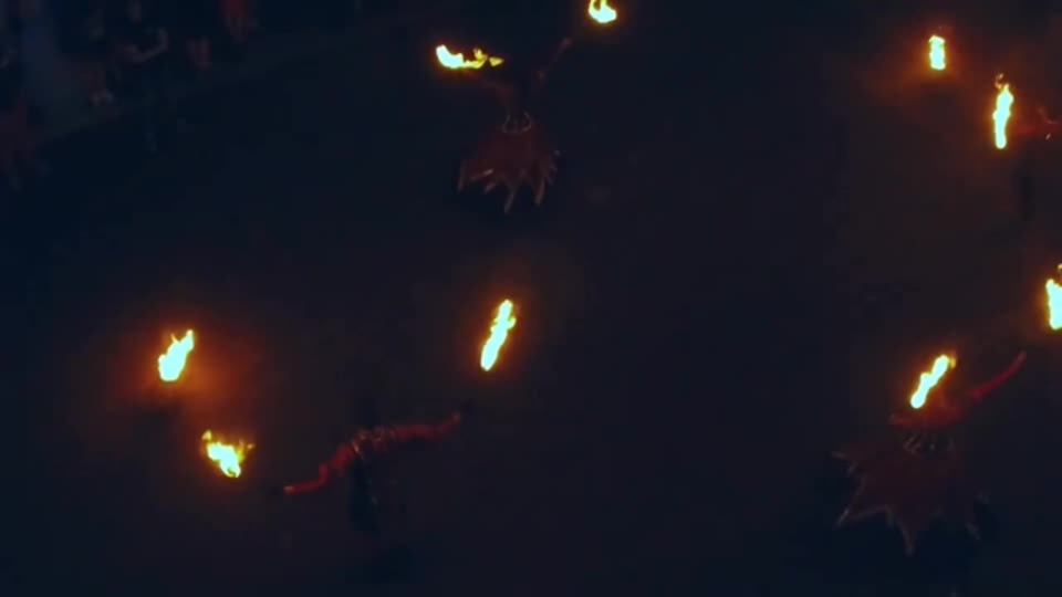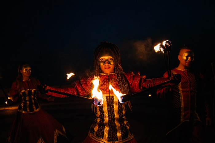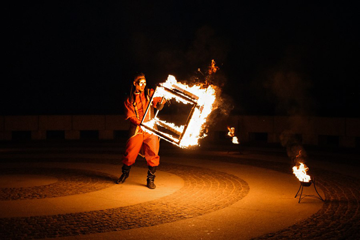 Dans ce spectacle de feu, les artistes de feu vénitiens utilisent une gamme fantastique de props de feu très impressionnants, notamment des torches, des parapluies, des cubes, des cordes enflammées, des éventails. Ils éblouissent également les invités avec des séquences de combat utilisant des épées enflammées, font tournoyer les flammes dans l'air en utilisant des cordes enflammées et explosent le ciel avec des lance-flammes.