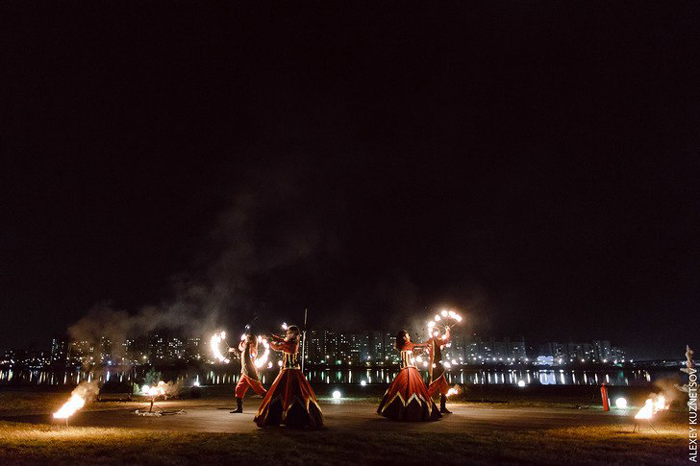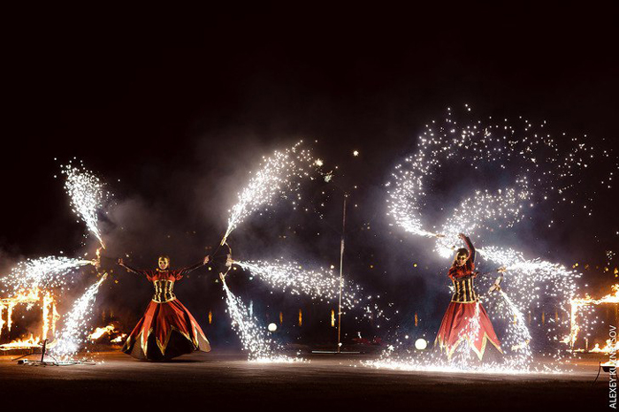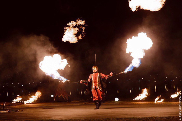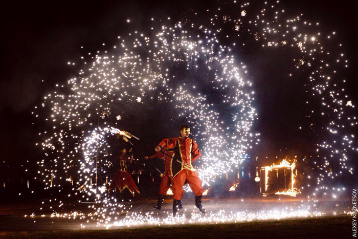 Basé à Saint-Pétersbourg, ce spectacle de feu vénitien à haute intensité comprend une gamme d'étincelles, de fumée et de flammes toutes magnifiquement chorégraphiées en des spectacles à couper le souffle. Les artistes de feu vénitiens hautement expérimentés sont habillés de costumes historiques très élégants et leur look est complété par des masques vénitiens dorés brillants.
