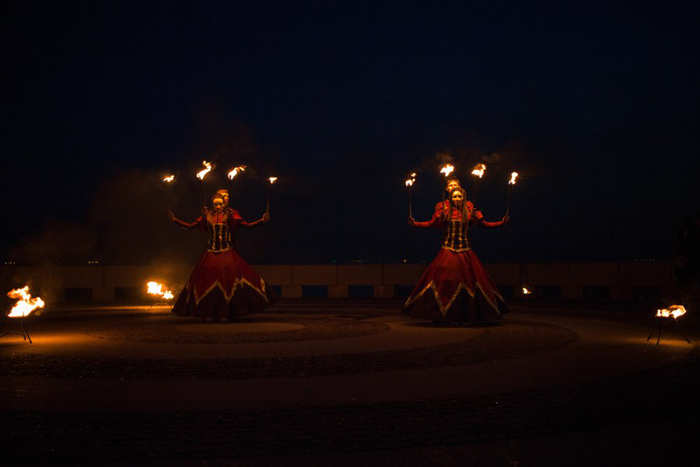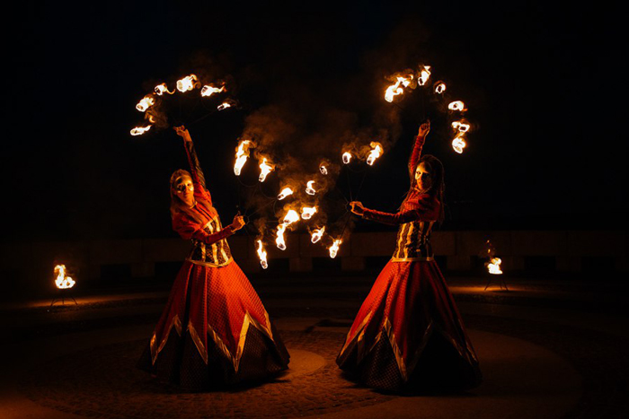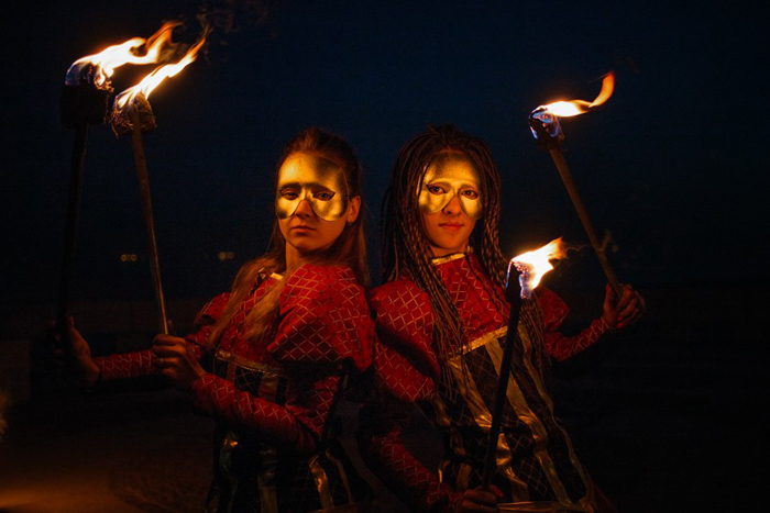 En plus d'un spectacle de feu à thème vénitien, ces artistes proposent un spectacle historique grec ou des numéros de feu haut de gamme simples.