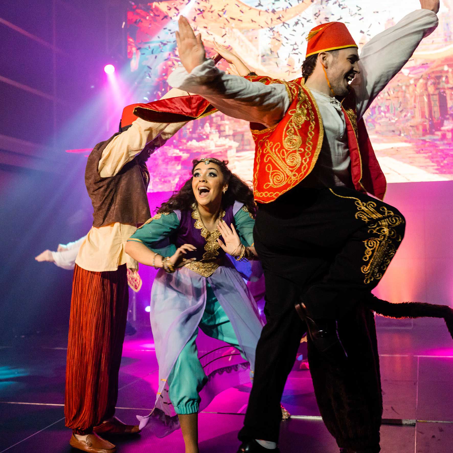 Avec des costumes à couper le souffle, des tubes pop entraînants et une chorégraphie époustouflante, notre distribution d'Aladdin offre un divertissement haut en énergie.