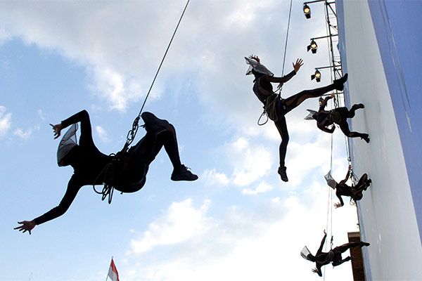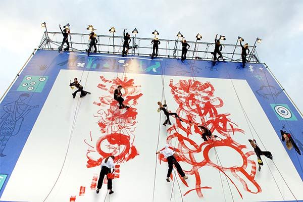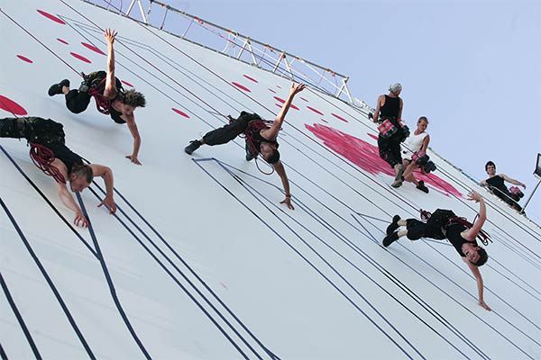 Peut être réalisé sur différents bâtiments et structures et propose également des performances sportives verticales et des spectacles de peinture verticale.