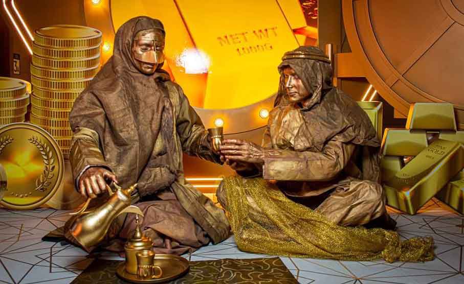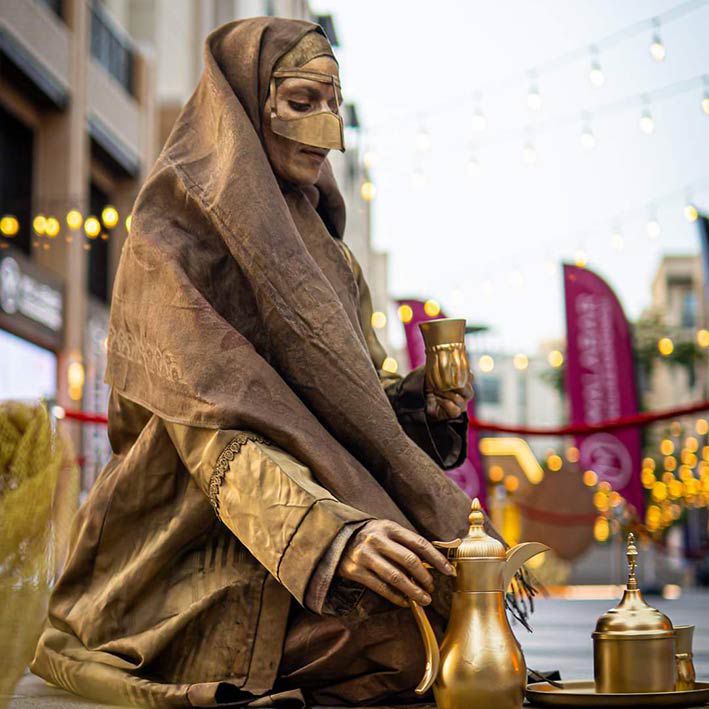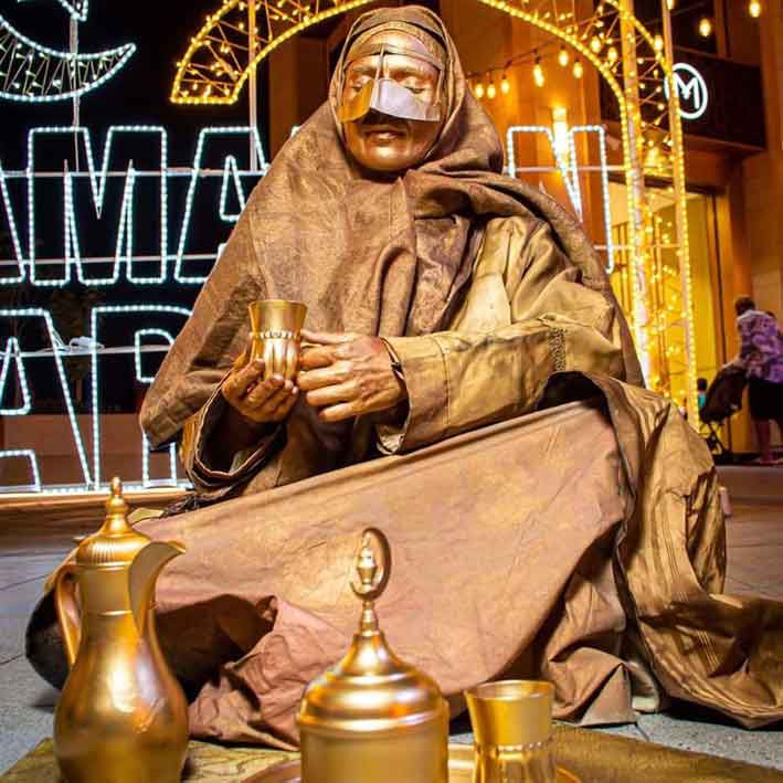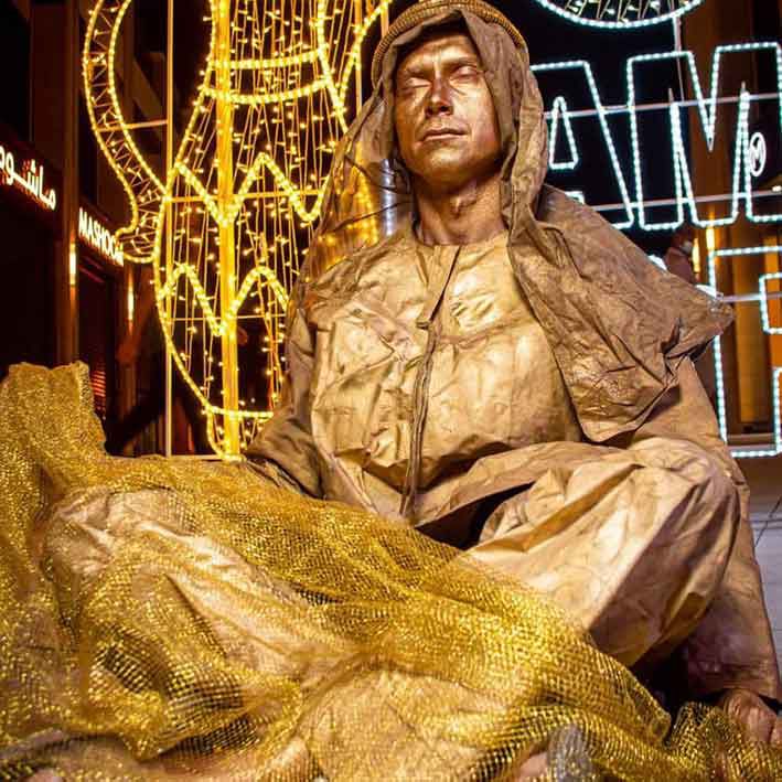 Ces statues vivantes masculines et féminines sont vêtues de costumes traditionnels arabes et restent immobiles sauf si on s'approche.