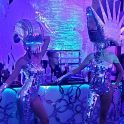 Ces artistes inspirés par le Studio 54 à fort impact, y compris des personnages à tête de boule à facettes et des hommes miroirs, créent des atmosphères immersives sur le thème du disco.
