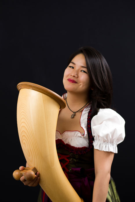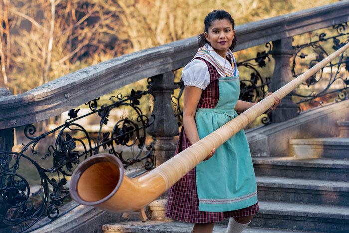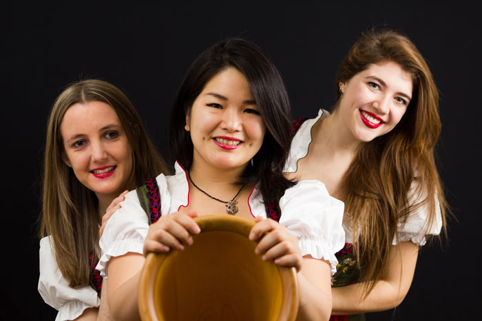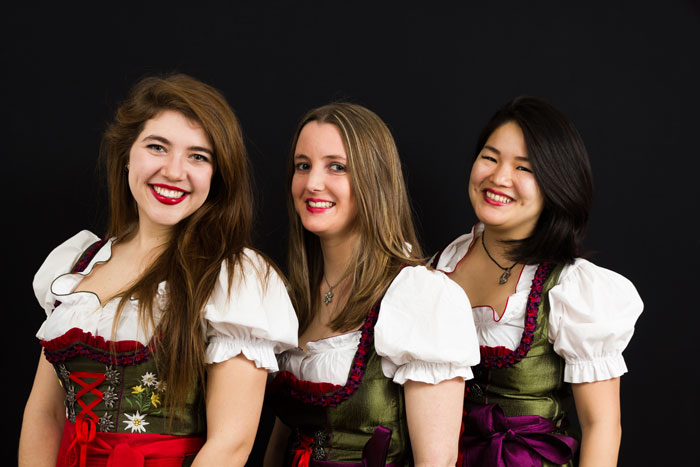 Délicieusement charmant trio de cor des Alpes entièrement féminin avec des membres internationaux du Canada, du Japon, du Pays de Galles et de la Suisse