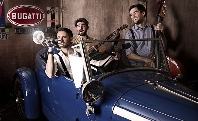 Élégant trio de jazz vintage avec trompette, guitare, voix et contrebasse, idéal pour créer une atmosphère élégante et mémorable lors de tout événement
