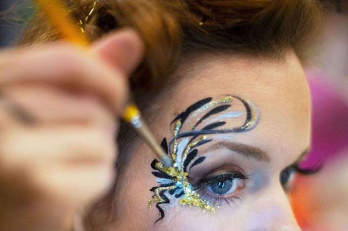Peut également inclure de l'art facial de style festival avec des bijoux et des paillettes ou de délicates fleurs, de l'art UV et du henné.