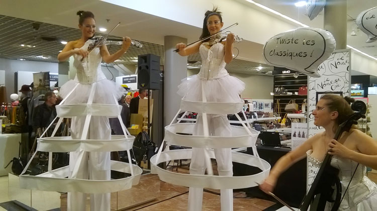 Jouant un large éventail de chansons, des tubes du moment aux classiques, ces marcheurs sur échasses violonistes offrent un numéro hautement interactif qui propose une superbe musique d'ambiance en plus de se mêler à tous vos invités.