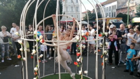 Un acrobate se produit dans une superbe cage dorée, racontant l'histoire enchanteresse d'une fille oiseau à travers des acrobaties gracieuses et captivantes.