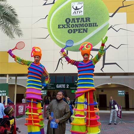 Nous avons été ravis de travailler avec une agence événementielle de premier plan au Qatar, afin d'assurer une animation familiale lors d'un tournoi de tennis à Doha. Nous avions besoin d'un numéro merveilleusement fantaisiste avec des costumes époustouflants, garanti pour faire rire les plus petits et nos échassiers colorés Doughnut Stilt Walkers ont fait l'affaire.