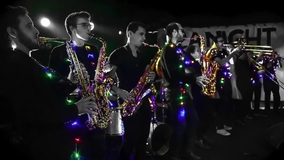 Up to 10 performers: a drummer, trumpet player, two trombone players, a tuba player, two tenor saxes, two alto saxes and a sousa bass player!