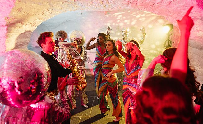 Your guests will be mesmerised as they sip champagne directly from this dazzling, interactive attire with our 70s-themed performer