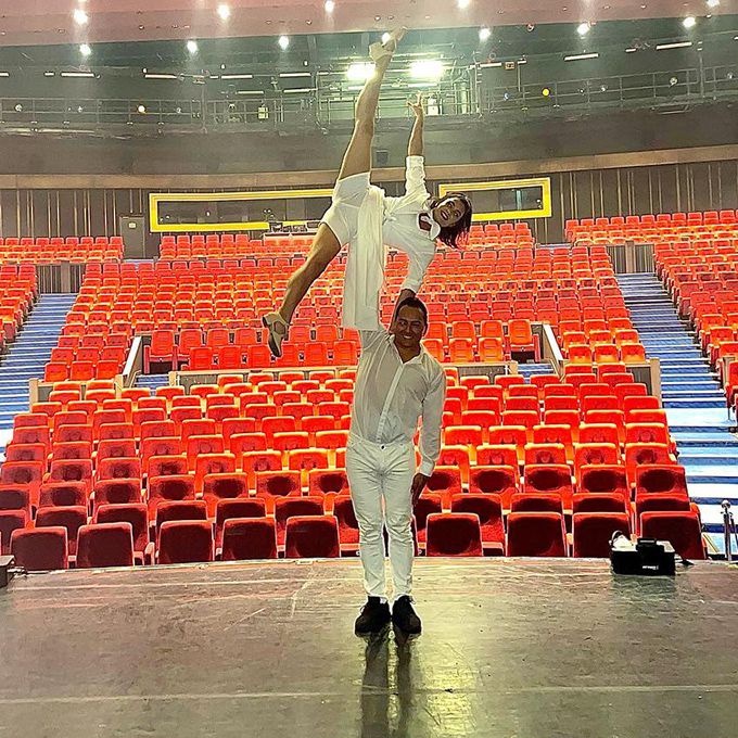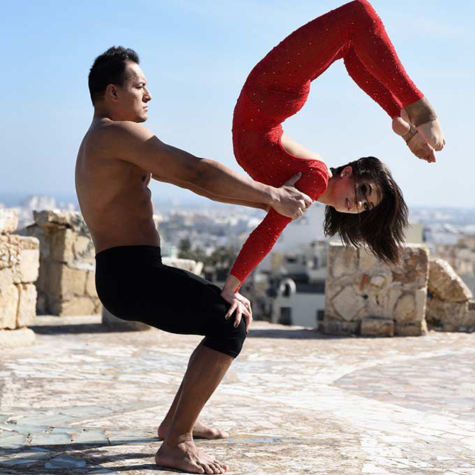 In addition to their captivating hand-balance routines, our cirque duo can also offer sophisticated aerial performances and other disciplines