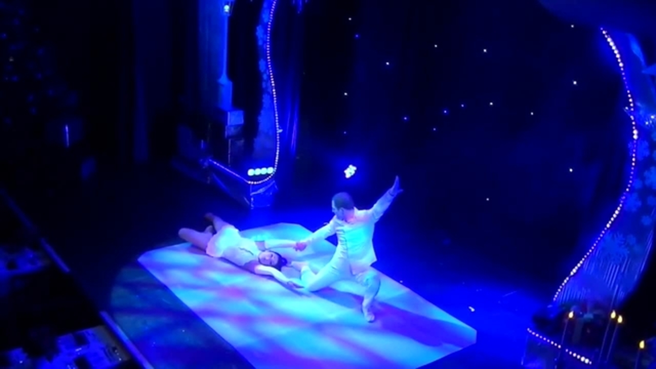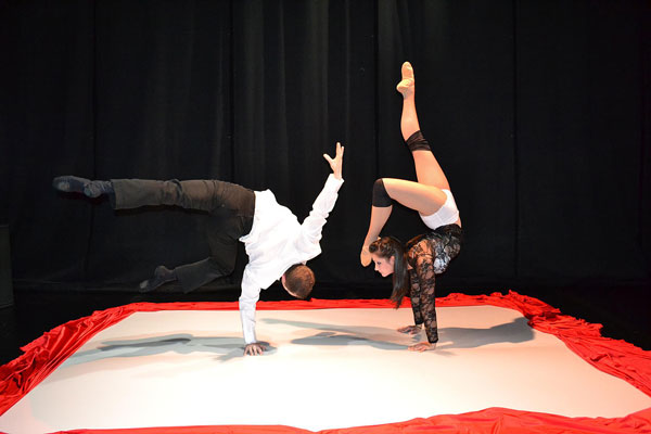 Their unique circus balance act is the only adagio balance act in the world performed on a slippery surface! A testament to their immense skill and athleticism, our balance duo is able to perform incredibly difficult balance acts on this slippery surface with unrivalled poise. The slippery performance surface instead lends itself perfectly to their elegant dance moves and allows them to effortlessly glide into each other’s arms.