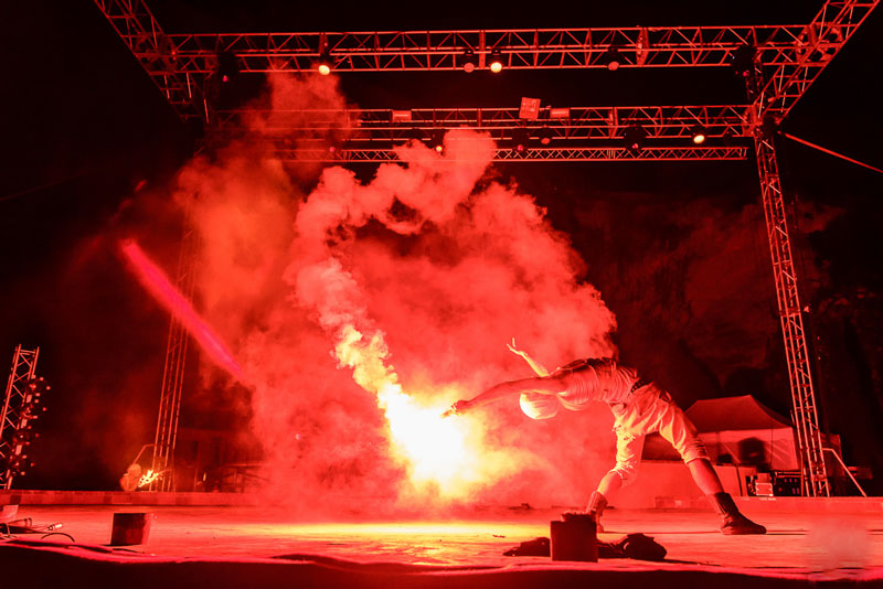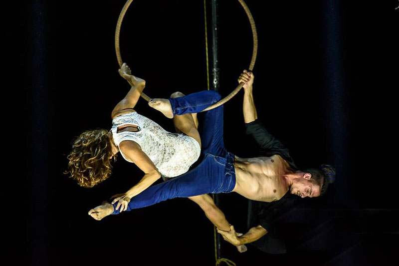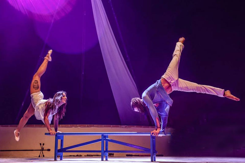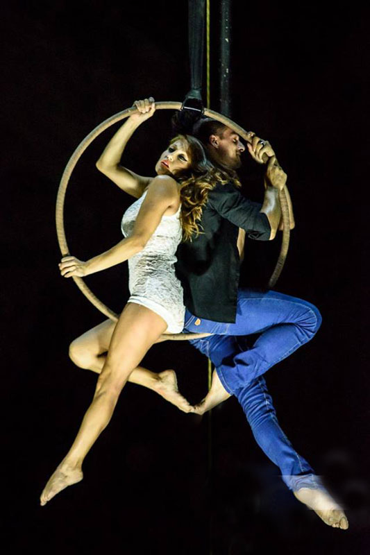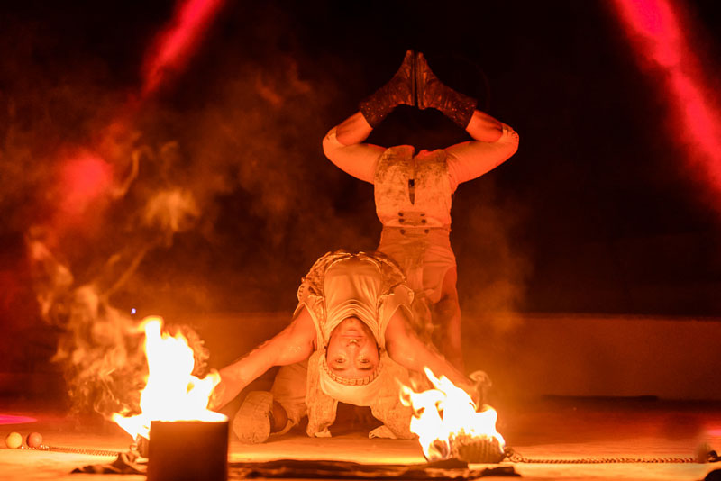 Acrobats and fire dancers join forces to bring a dancing with fire act that goes beyond what is merely impressive. A combination of captivating aerial routines, ground acrobatics and fire elements, this fire act adds incredible elements from different circus disciplines resulting in an astonishing arobatic fire dance.