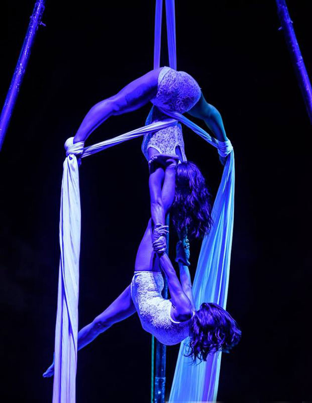 Skilled aerialists carry out a beautifully choreographed aerial silk act twisting and turning through the air and performing breathtaking falls. Our aerial dancers also execute an aerial hoop performance with exquisite elegance, showcasing their flawless technique and prodigious talent.