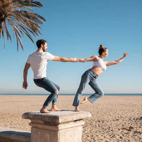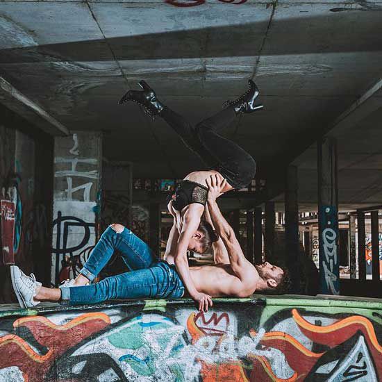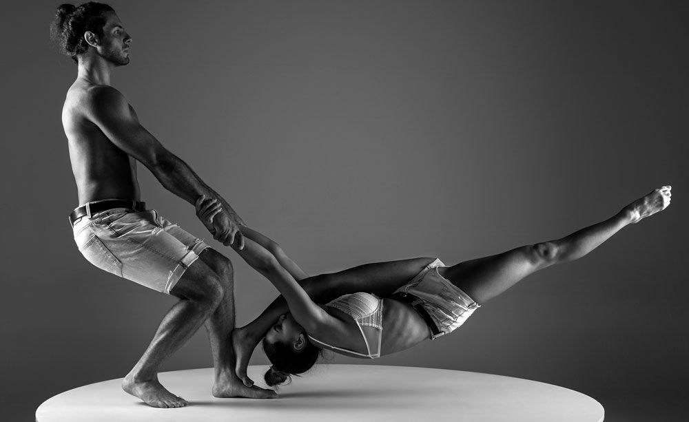 A breathtaking acrobatic duo performing dramatic choreographies filled with stunts, dance, flexibility and emotion