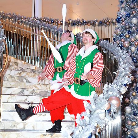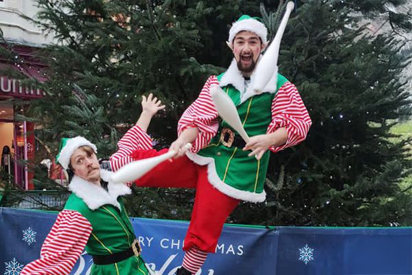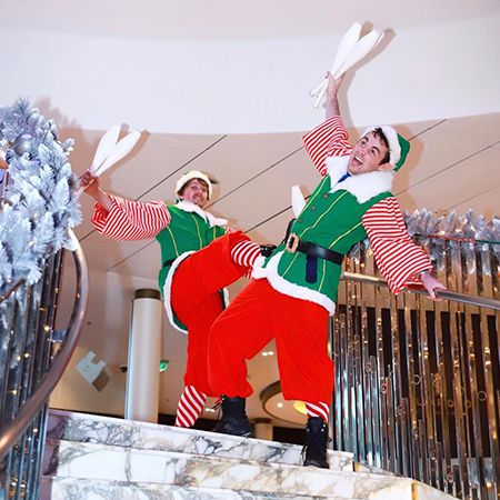 A jolly duo of mischievous circus elves who can bring fun, chaos and juggling to your festive event and spread holiday cheer