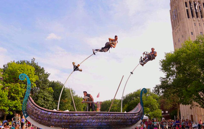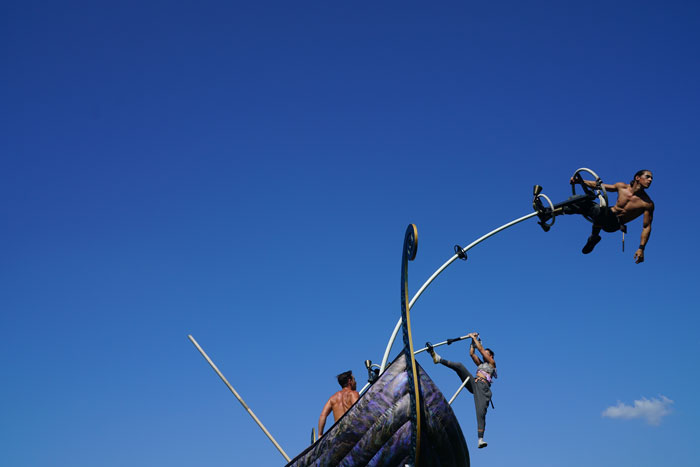 Based in Australia, the utterly amazing Acrobatic Sea Themed Show uses a large ship as the centre piece of its performance. Acrobats sway and swoop around on large swaying poles disguised as sailing masts and rowers whilst delivering a storytelling theatrical performance. The acrobats sway on the poles in motion with movements of the sea or wind.