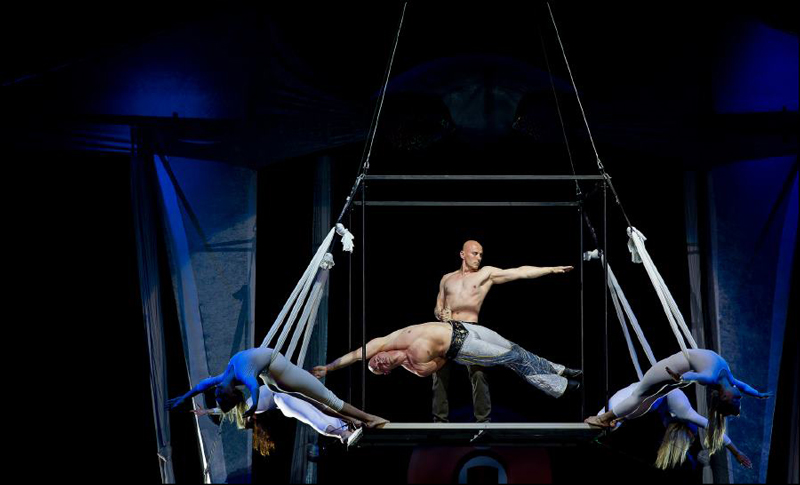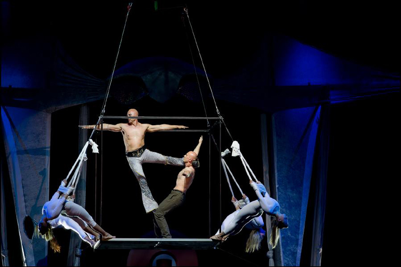 Performed by two skilled male acrobats with more than 25 years of experience as circus artists, this breathtaking aerial acrobalance act is majestically executed whilst our acrobalance duo is up in the air. Our talented artists perform this visually stunning aerial acrobalance act in a cube structure suspended from the ceiling and guarded by four silk aerialists.