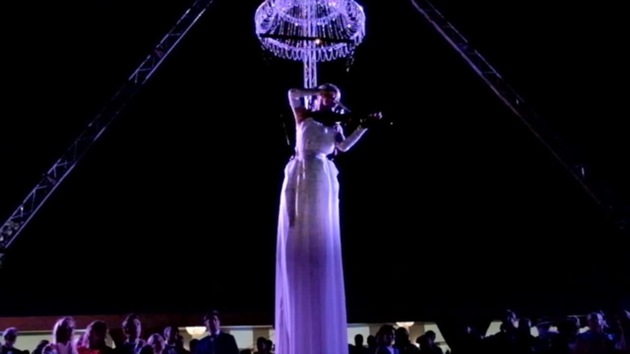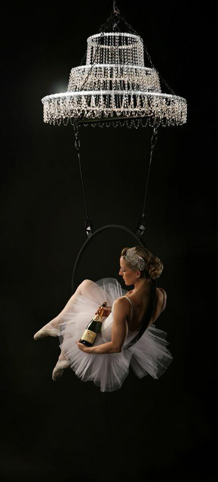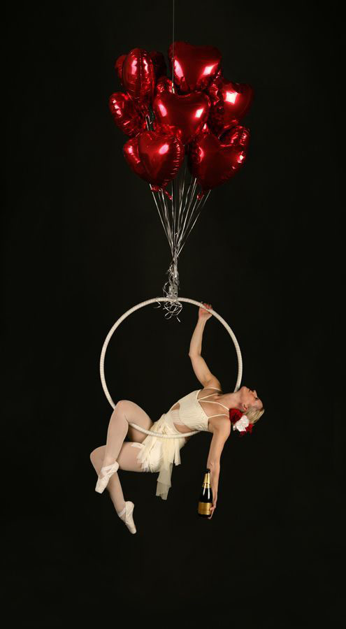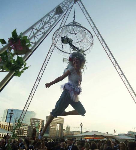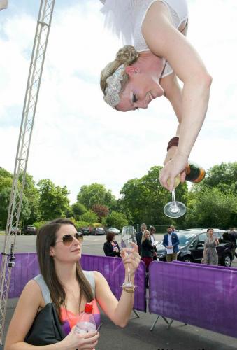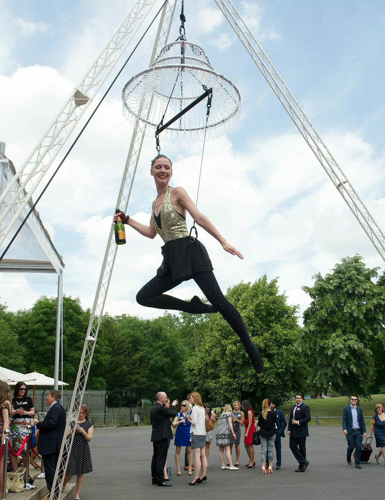 These highly talented aerialists serve champagne from above, in harness or on simple aerial hoops, whilst their amazing violinists can play glorious music whilst upside down!