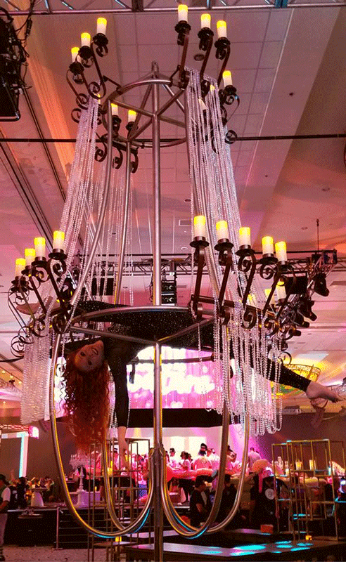 Fantastic as an opening act for, our chandelier aerial dancers will perform twists and turns with exquisite elegance and carry out an upside-down choreography while hanging from this fascinating giant flying chandelier. Available in different lineups, this aerial chandelier act can be booked with one or two aerialists.