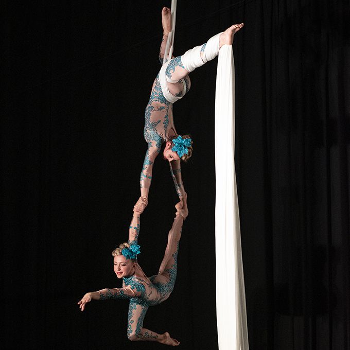 These aerialists offer custom show formats with speciality apparatus like the Aerial Carousel Trio, Hoop‑eze Trio, GeoSphere, and Mega‑Cube
