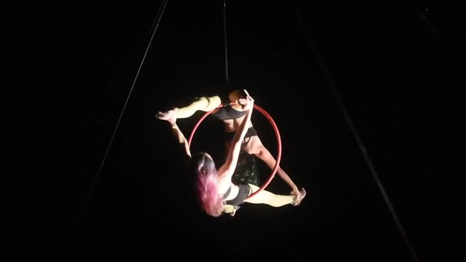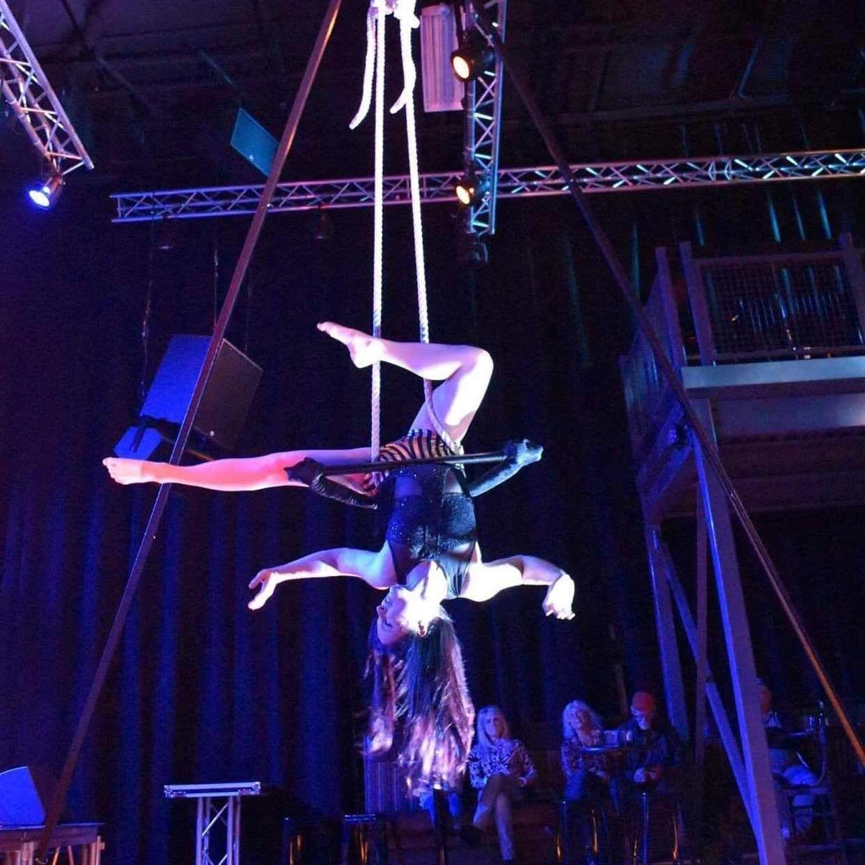 With a variety of set lengths, the artists can perform using silks, hoop, trapeze, straps, aerial cube and hammock