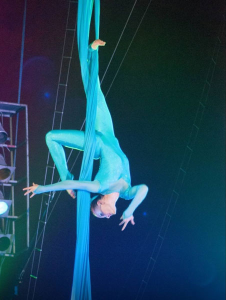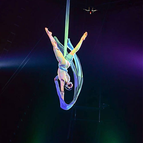 Performing with grace and elegance, our circus aerial act offers a truly captivating aerial ‘silks’ show that demonstrates her impressive flexibility, strength and precision with beautiful routines and creative choreography that is certain to inspire and delight all who witness it. This versatile circus artist is also able to bring her one of a kind aerial hoop act to your event, performing visually spectacular routines whilst suspended from a uniquely tear drop shaped aerial hoop for an unforgettable experience.