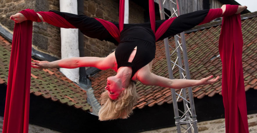 Spectators will watch on in amazement as a beautiful aerialist performs elegant climbs, drops, twirls and spins on coloured silks, whilst below her fire artists perform a range of daring stunts! Fire sticks, clubs, flares, pyrotechnics and fireworks create a whirling kaleidoscope of white-hot sparks and orange flames with a backdrop of atmospheric music.