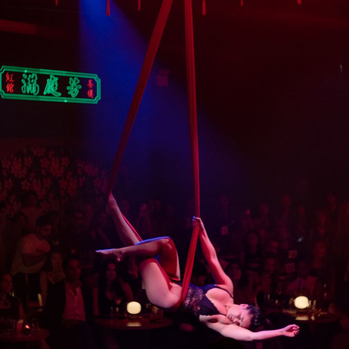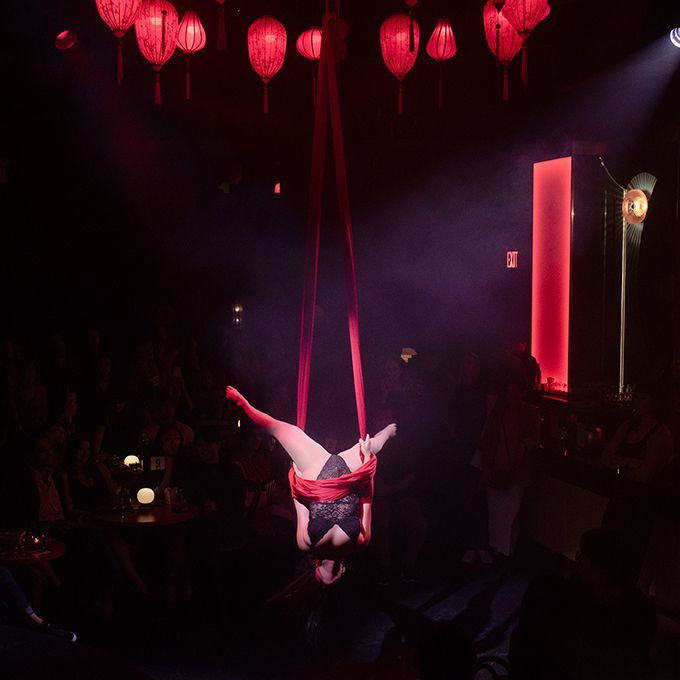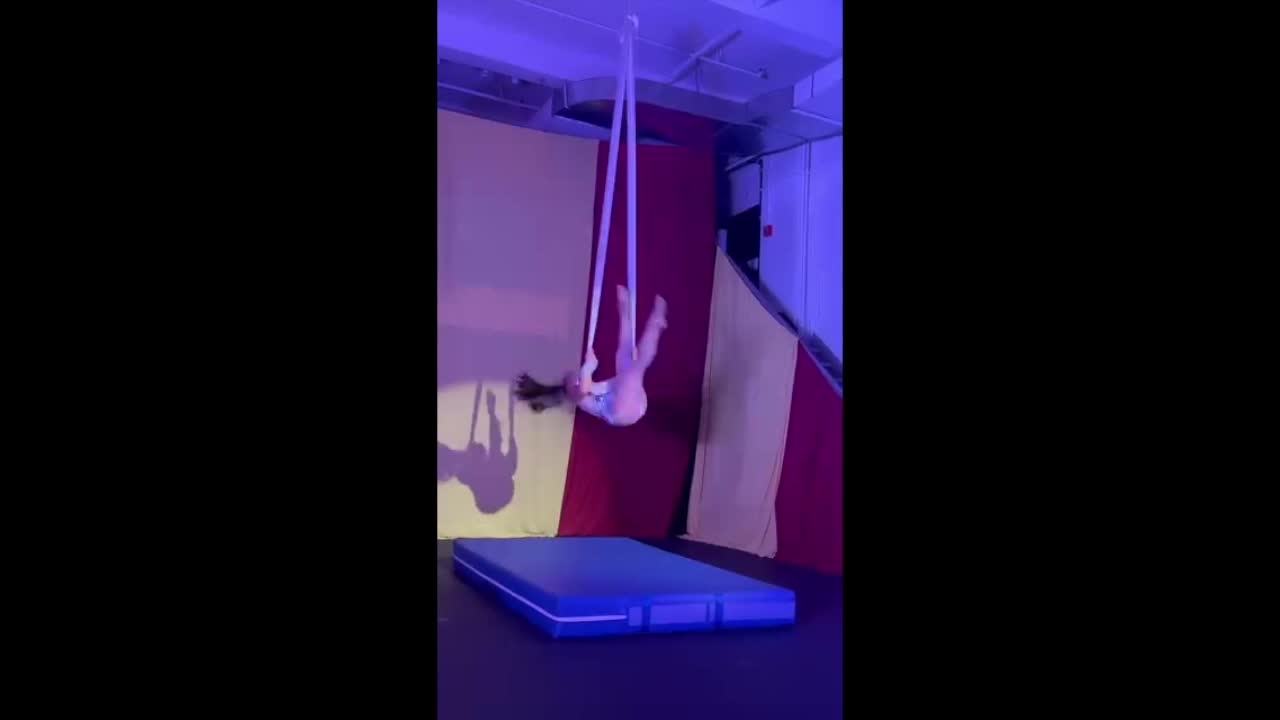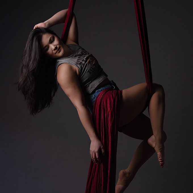 A professional aerial hammock performer with experience captivating audiences at top NYC venues like The Slipper Room and Red Pavilion