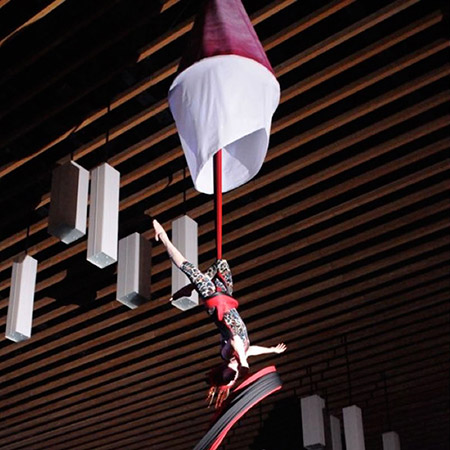 Your guests will appreciate the beautiful lantern sculptures as they hang suspended from the ceiling of your venue. However, they will have no idea that a talented and experienced aerialist is hidden within. An aerial artist can remain hidden for up to two hours prior to their aerial performance. When the time is right, the aerial acrobat will lower their fabric and perform a mesmerizing aerial performance that will make your event unforgettable.