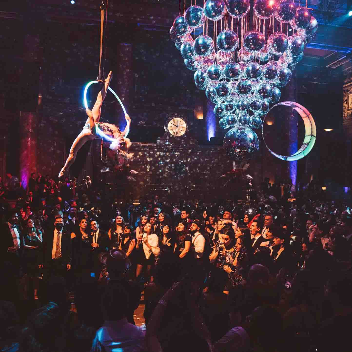 Our beautiful female soprano sings live in the air on an aerial hoop, moon, silks and aerial pole, often unamplified creating a beautiful atmosphere