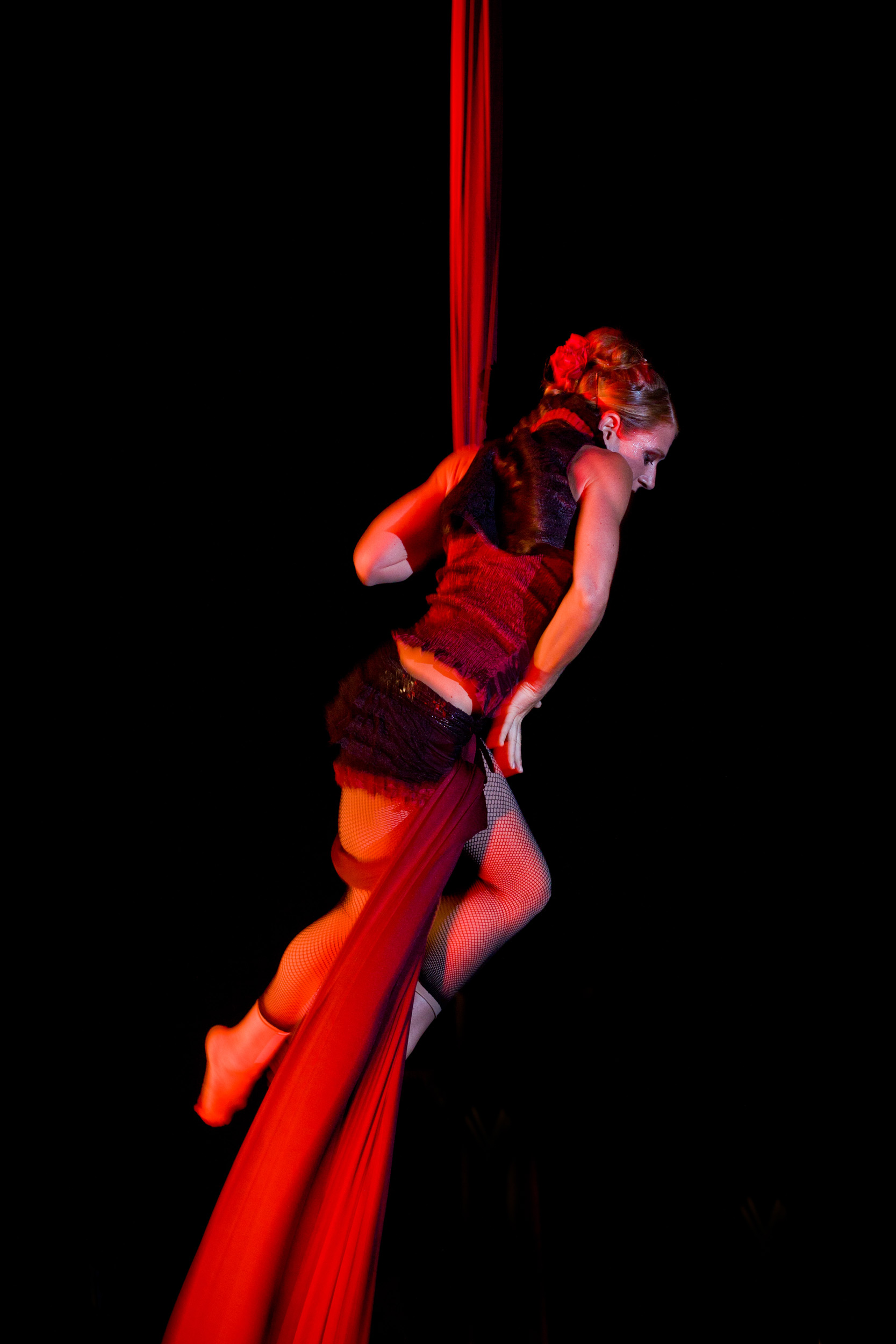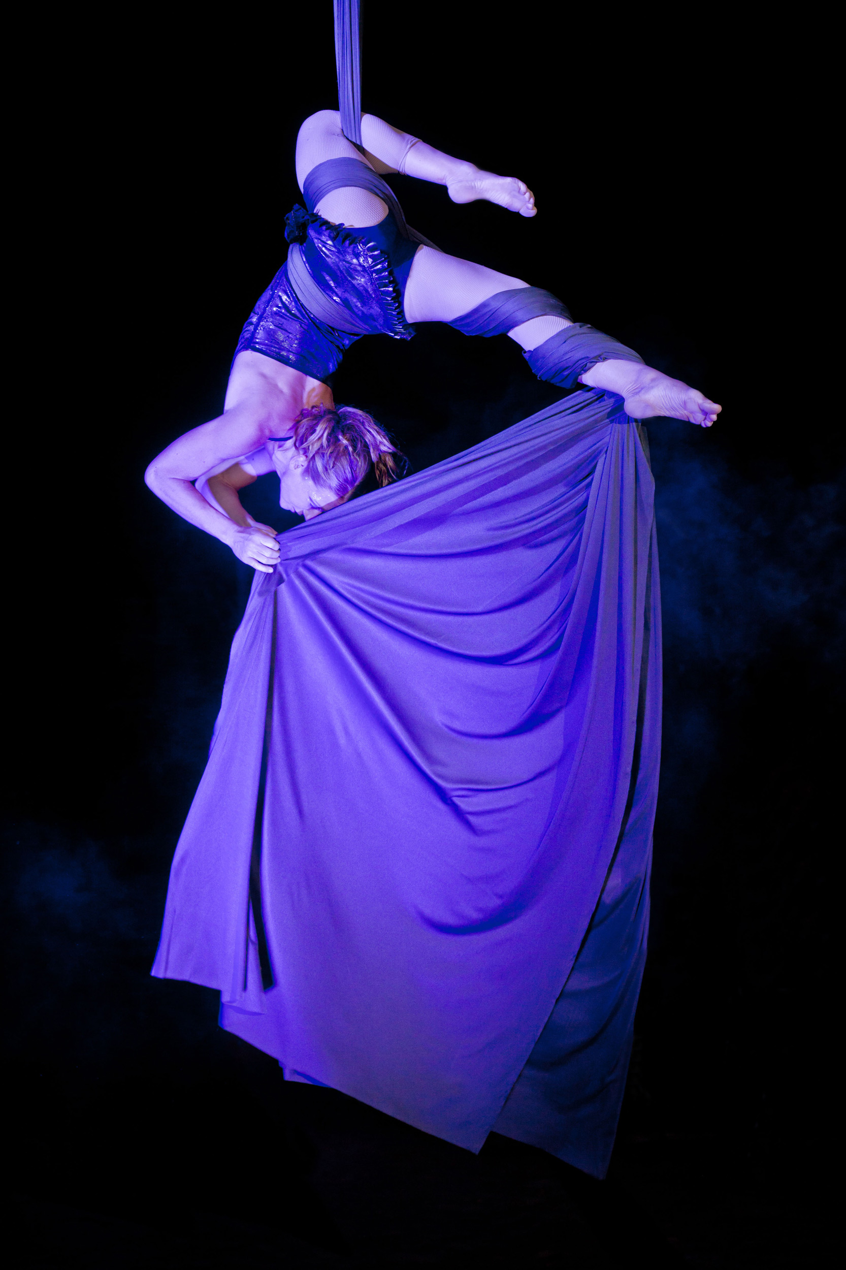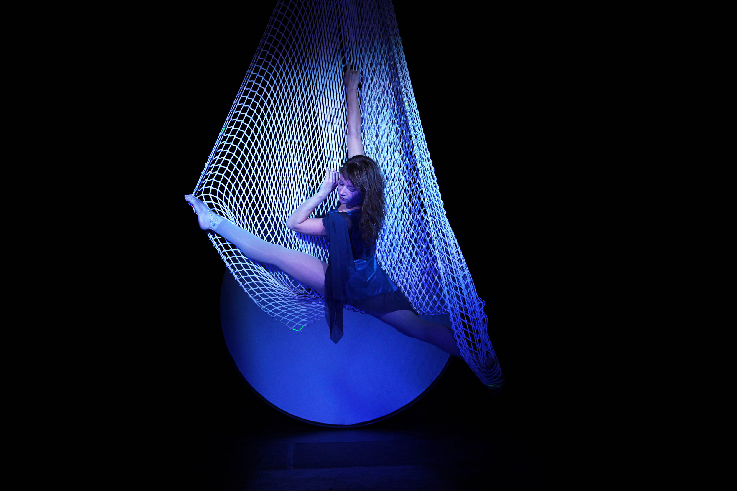 Her skills reach a variety of aerial apparatuses such as Silk, Lyra/Hoop, Harness flying, Chord Lisse and Aerial Net. Taking off to fly over the audience including her Counterweight-system in any of her routines shifts a static act to a dynamic and breath-taking aerial performance.