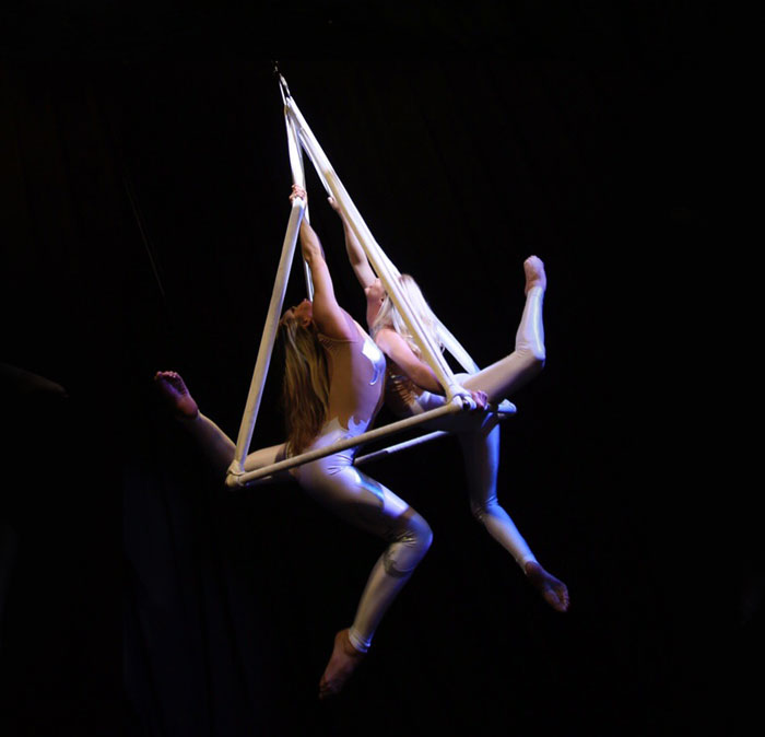 Our incredible Aerial Pyramid Duo is a brilliant aerial performance featuring two stunning female acrobats on a totally unconventional aerial prop. This mesmerising stage act is a visual delight that captivates it’s audiences though perfectly choreographed acrobatics and fluid contortions whilst suspended above the ground. They short, high impact show is guaranteed to make a great impression with your guests.