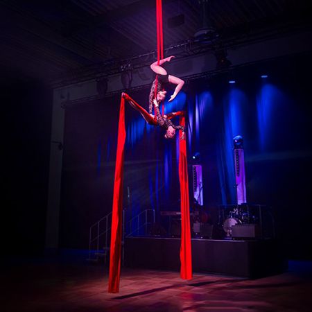 Ideal entertainment for a wide range of occasions, this aerial silks act is especially suitable for galas, ceremonies, theatres, after dinner experiences, etc. Our aerial silk dancer and aerial silks duo are also a great addition to variety shows and bigger theatre productions and they can also adapt her routines to different performance spaces and situations. For instance, they can perform high above the crowds at festivals and concerts or be the perfect way to entertain guests in art galleries or exhibitions.