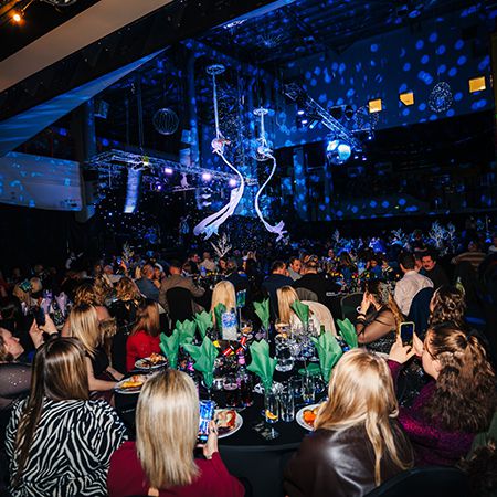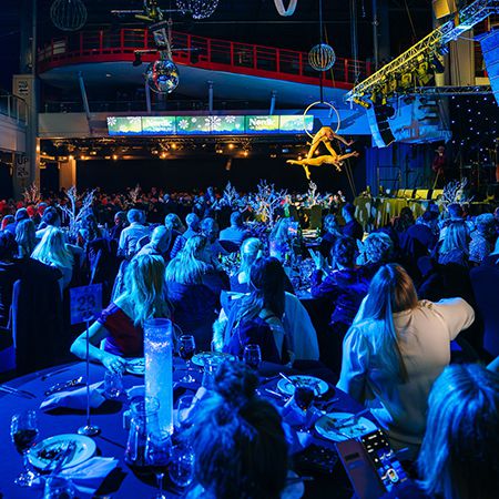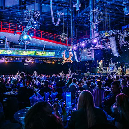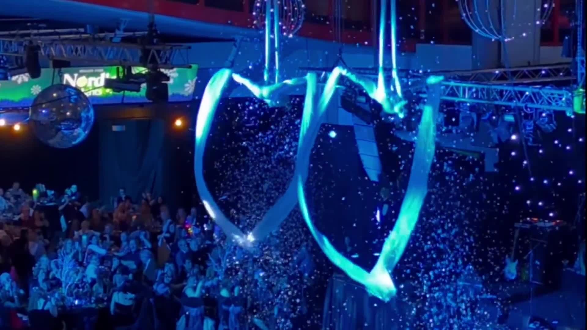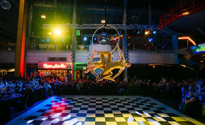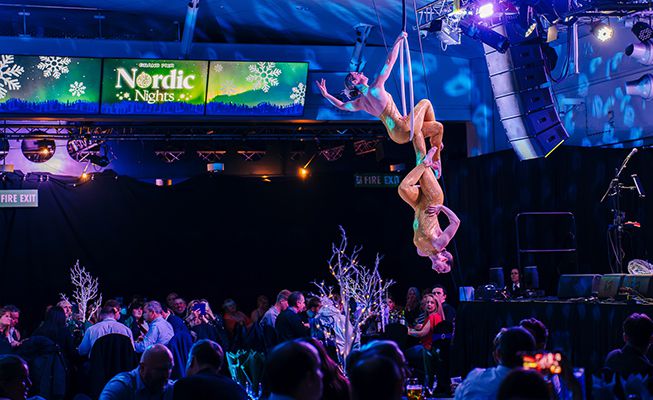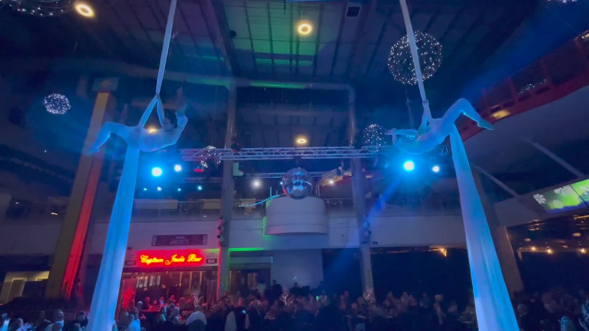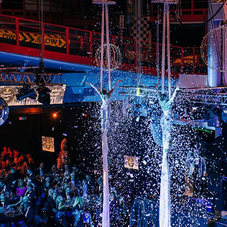 Offering two forms of cirque-based performance, they can be suspended over your guests on aerial hoops or dangle from long aerial silks