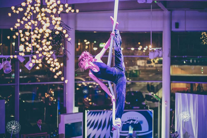 This elegant aerial dancer can fully tailor her aerial shows to best suit the event. She has multiple costumes and silk colours that can be tailored to suit a theme or colour scheme. Additionally, the aerial silks performer can choreograph a routine using music the client chooses.