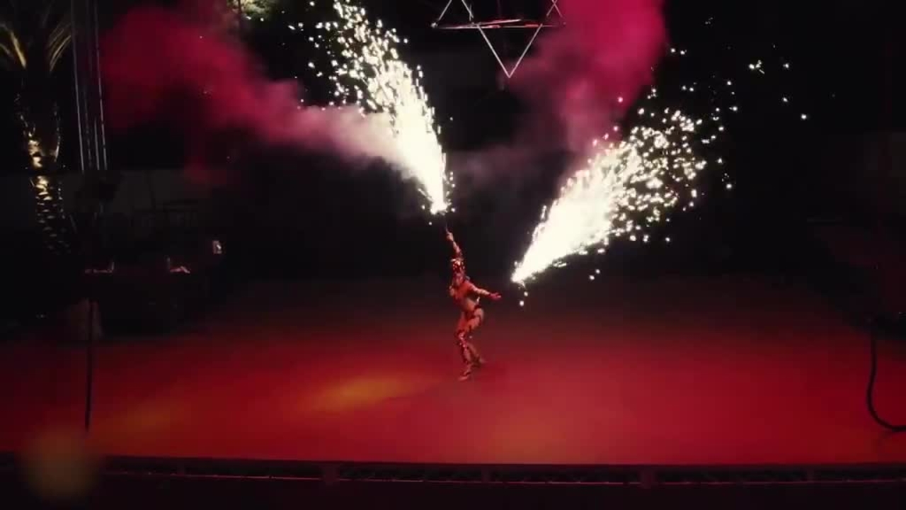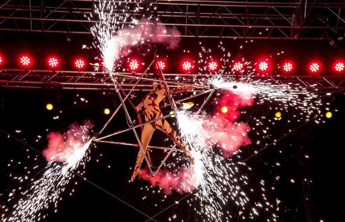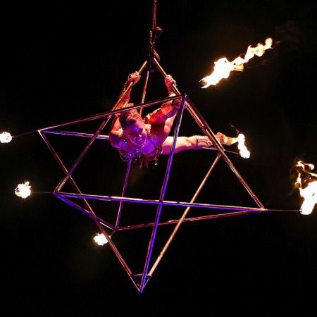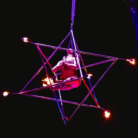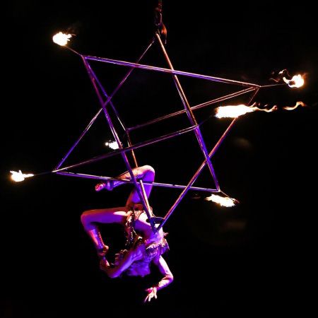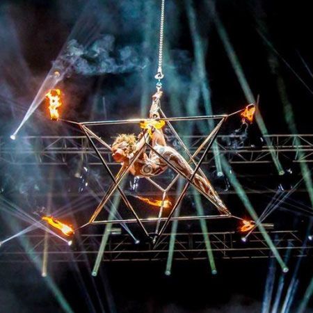 Our aerialist performs on a Merkaba, a unique aerial prop with attached fire spots for an epic pyro finale, that is also available without fire