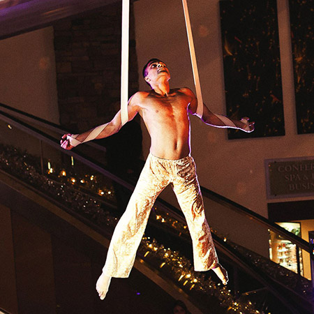 Using his strength and agility, our aerial acrobat moves through the air with grace and elegance. Using only straps suspended from above, his performance is mesmerizing and captivating. Our aerial straps act is a beautiful visual addition to you event, and will act as a beautiful and powerful focal point in the venue.