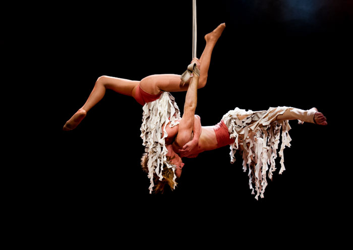 Both learning circus skills during childhood, the aerial artists behind this beautiful act trained at Rotterdam University of the Arts and Espace catastrophe in Brussels respectively, before meeting at acrobatic company Corpus Acrobatics in Holland. Instantly recognising a connection, our aerialists began to practise together, and it is from their that their aerial straps act grew. Fearless and enthusiastic, the couple captivate viewers with their powerful on-stage chemistry.