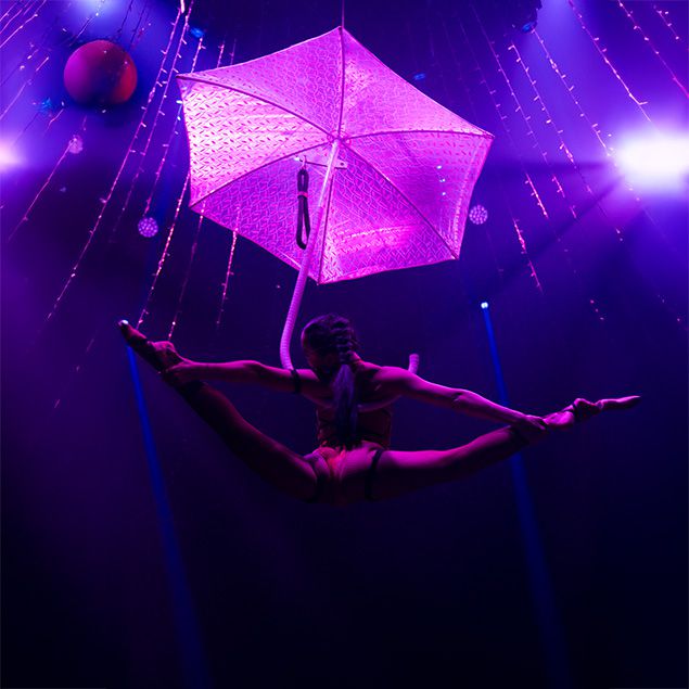 Performing on a uniquely styled prop, this aerial dancer brings fun and whimsy to the stage in a performance that audiences of all ages will love