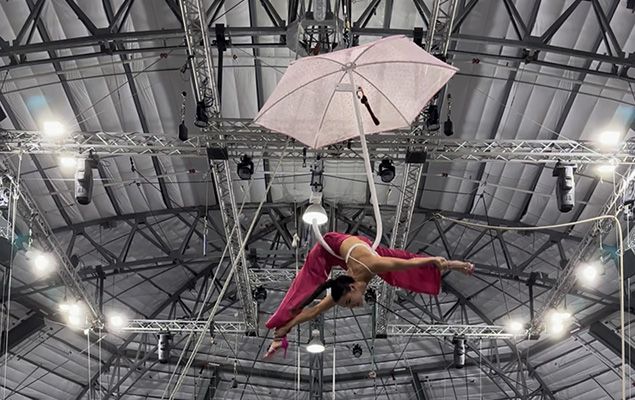 Mongolian contortionist showcasing the unique aerial umbrella, blending stunning strength and flexibility high above the crowd in stunning fashion