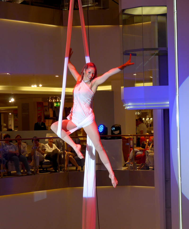 Our skilled aerial performer is can perform using aerial straps, silks and vertical tissue; plus trapeze, dance trapeze and acrobatics