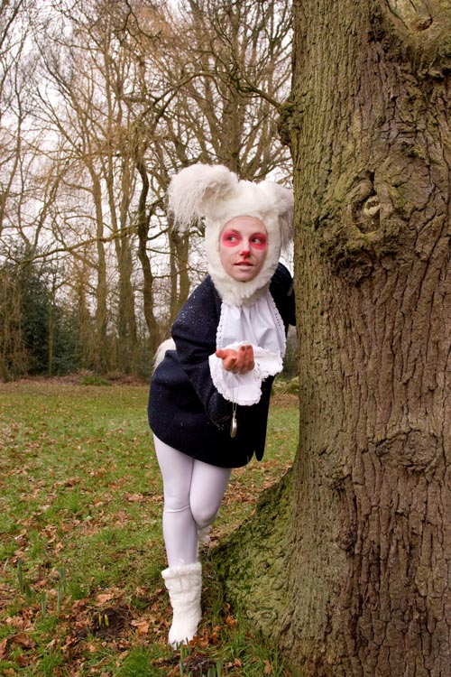 Last but not least our white rabbit can be booked as two types of acts from performing on bouncy stilts to performing on foot, climbing into the air to perform an aerial act on white stilts.