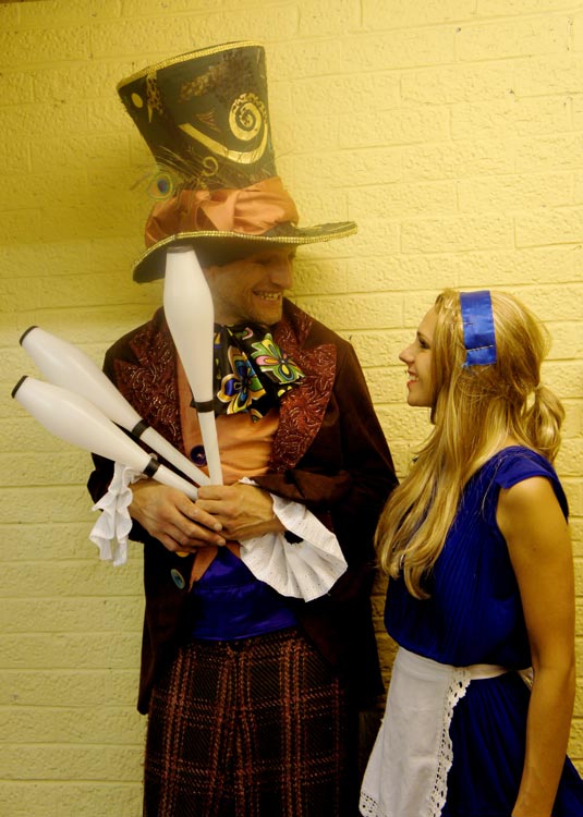 In addition to our aerialist Cheshire Cat our leading lady Alice, performs outstanding contortion acts as she squeezes inside a small 17 x 17 x 21 inch house after drinking the shrinking potion. Offering a brilliant and highly interactive walkabout act the Queen of Hearts roams about your event causing havoc and ordering guests around whilst our Mad Hatter juggles with plates and tea cups!