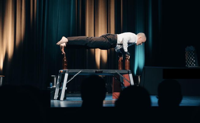 This circus act combines danger, precision, and visual shock as towering bottle stacks become the stage for extraordinary balance performance art