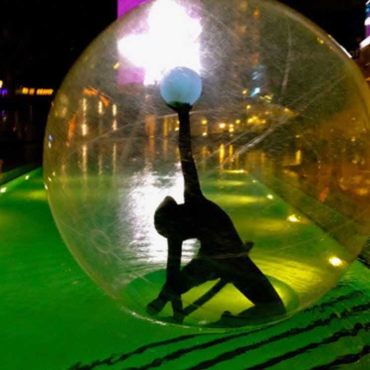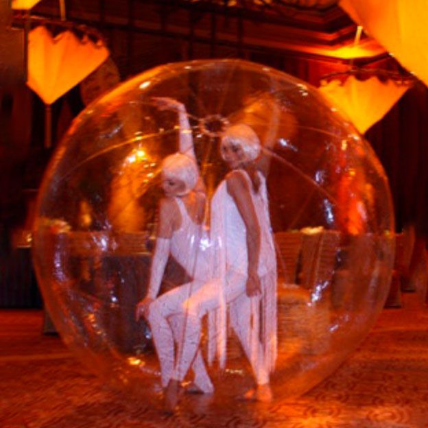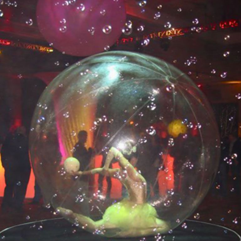 This 7′ diameter vinyl floating sphere surrounds an authentic cirque gymnast and will be the talk of the party